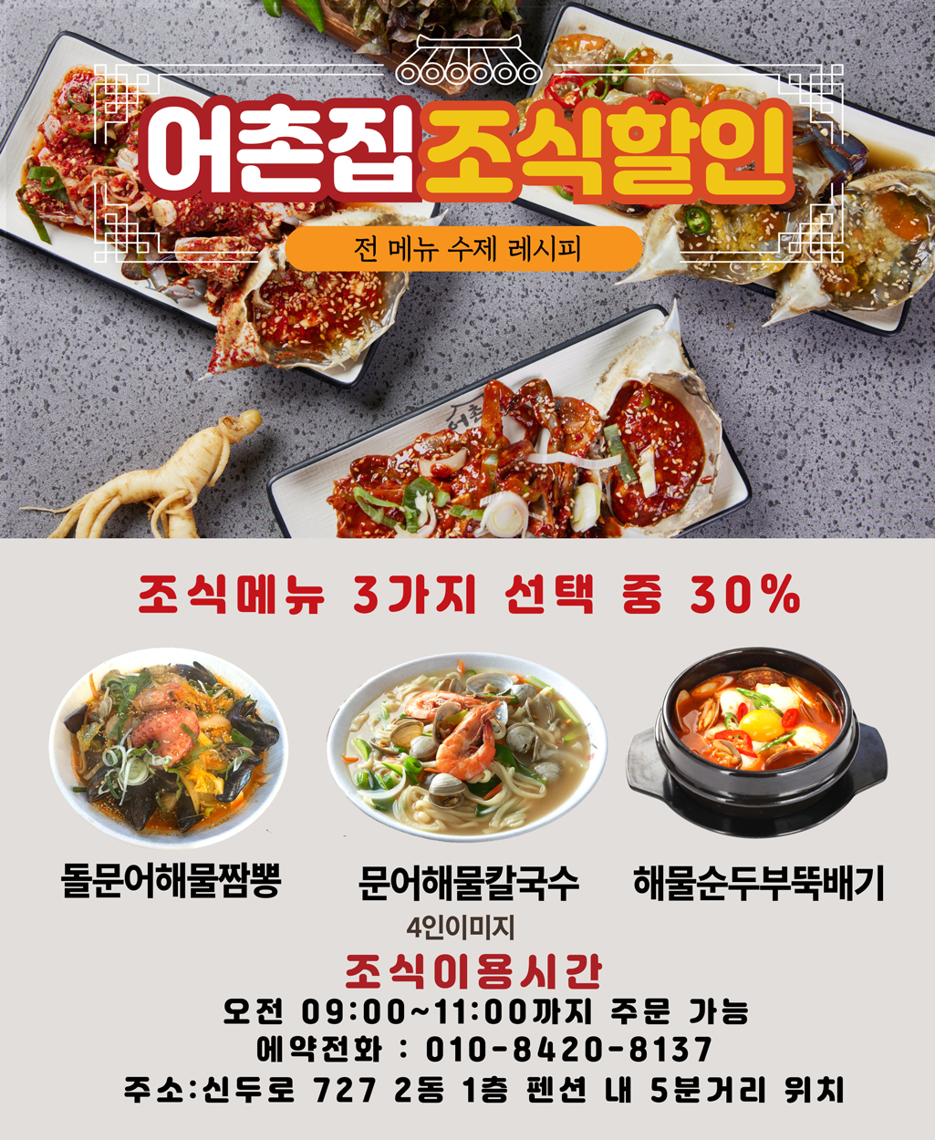 조식메뉴 : 돌문어해물삼합 or 돌문어해물칼국수 or 해물순두부뚝배기 3가지 중 선택가능
